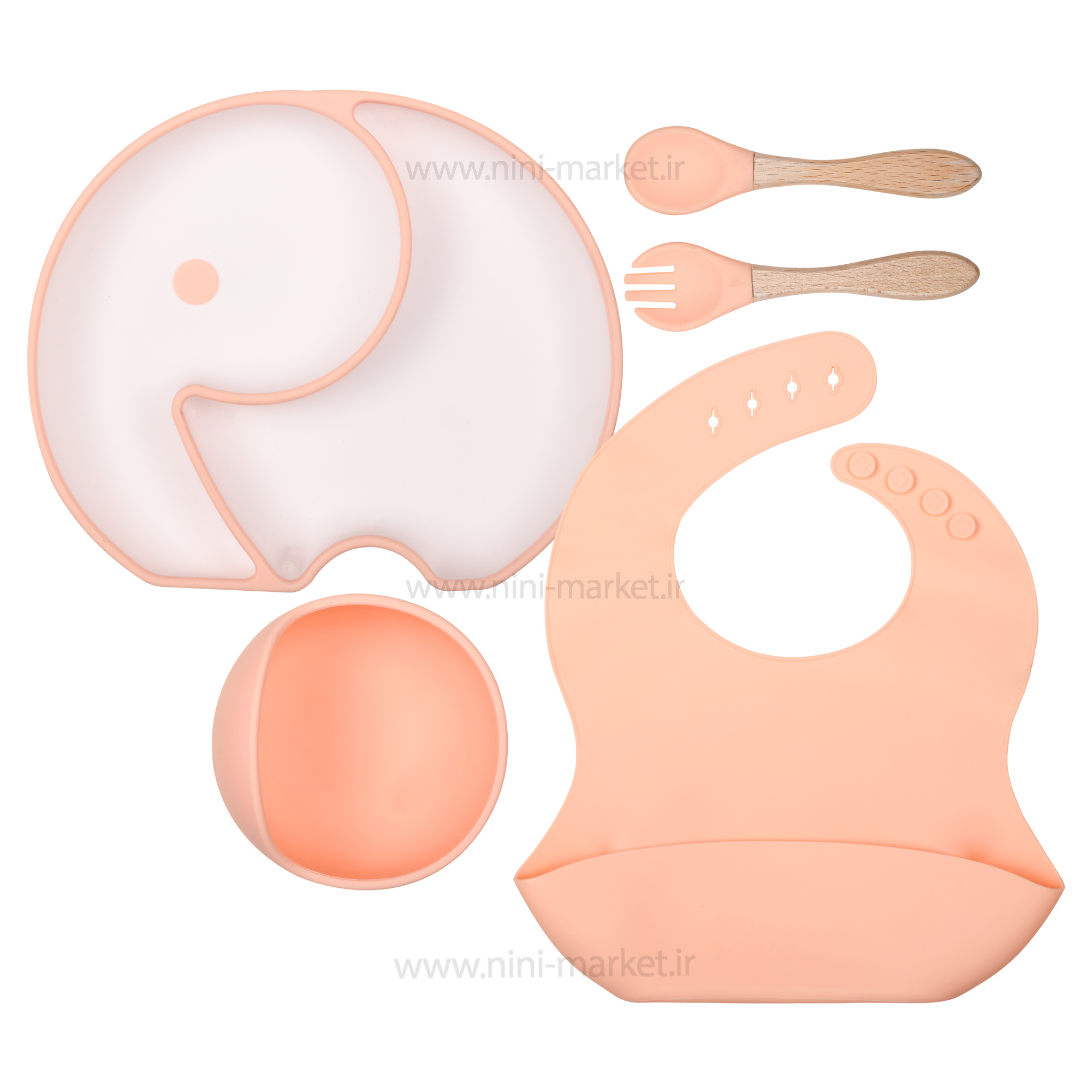 ست ظرف غذای سیلیکونی 5 تیکه طرح فیل رنگ صورتی baby 4 life، یکی از بهترین ست های ظرف غذا است که یک مجموعه کامل از لوازم غذاخوری کودک است. این ست غذاخوری، شامل: