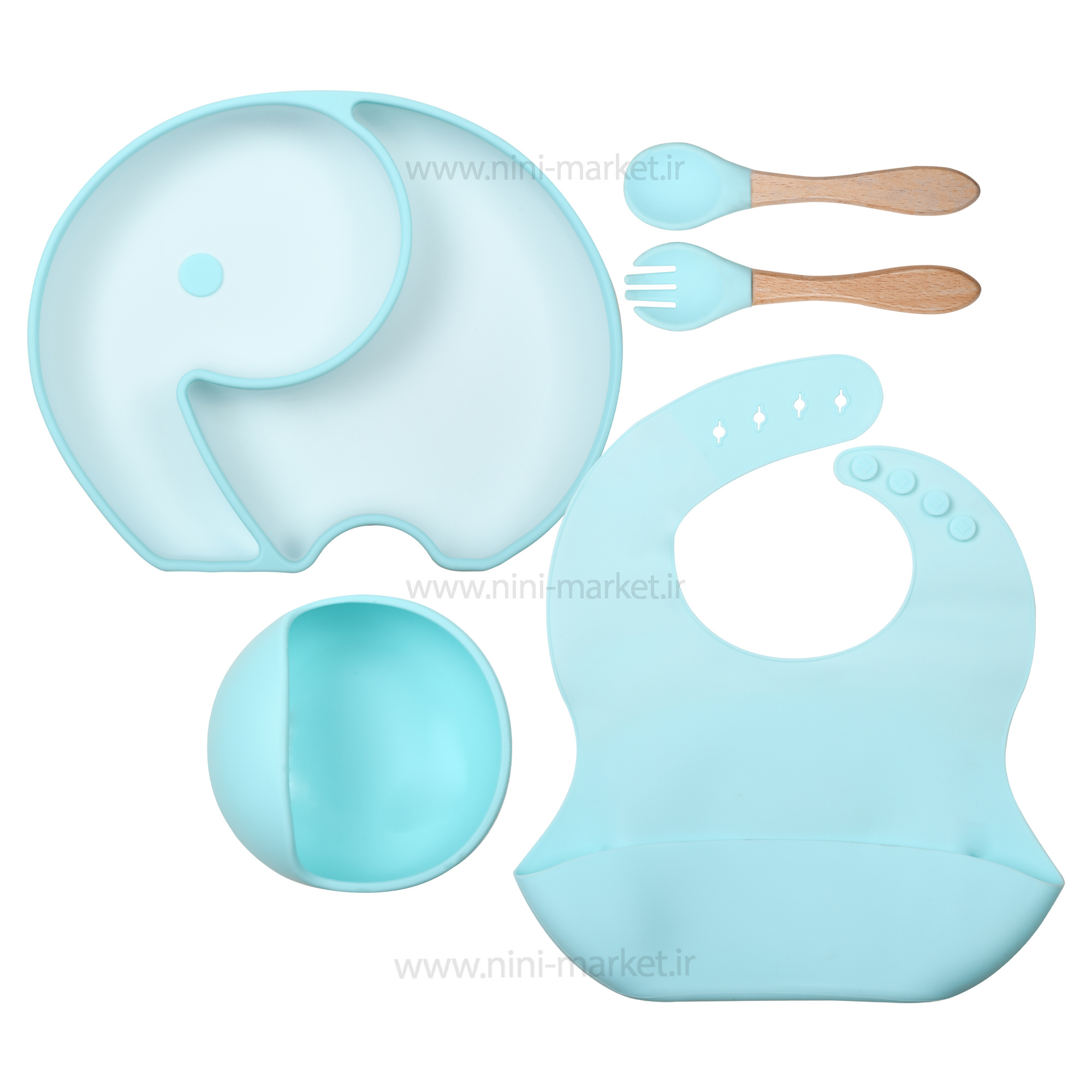 ست ظرف غذای سیلیکونی 5 تیکه طرح فیل رنگ آبی baby 4 life، یکی از بهترین ست های ظرف غذا است که یک مجموعه کامل از لوازم غذاخوری کودک است. این ست غذاخوری، شامل: