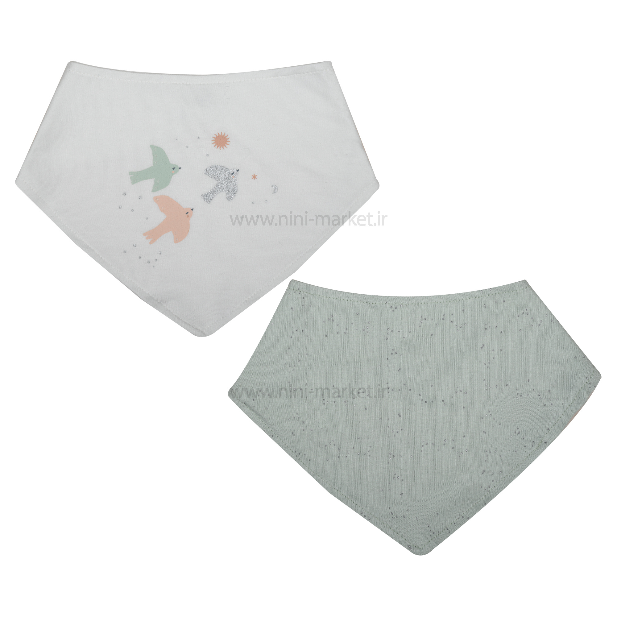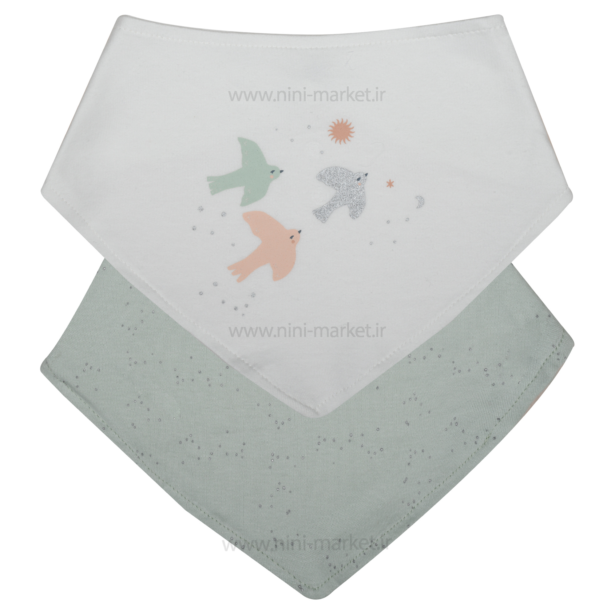 پیشبند دو عددی نخی طرح پرنده رنگ سفید سبز برند Bibaby، بسیار سبک و از جنس نخ است. این پیشبند ها بسیار نرم و لطیف و ضد حساسیت هستند. پیشت پیشبند با دکمه به راحتی باز و بسته می شود، کودک را اذیت نمیکند و باعث ایجاد حساسیت نمیشود. بعد از کثیف شدن میتوانید آنرا توسط دست و آب ولرم و یا با استفاده ازماشین لباسشویی بشویید. این پیشبند مدل دستمال گردنی است و علاوه بر قابلیت پیش بند بودن، نوزادتان را خوش تیپ تر می کند و قابل ست کردن با انواع لباس نوزاد است. شما میتوانید این محصول زیبا را از سییسمونی نی نی مارکت تهیه کنید.
