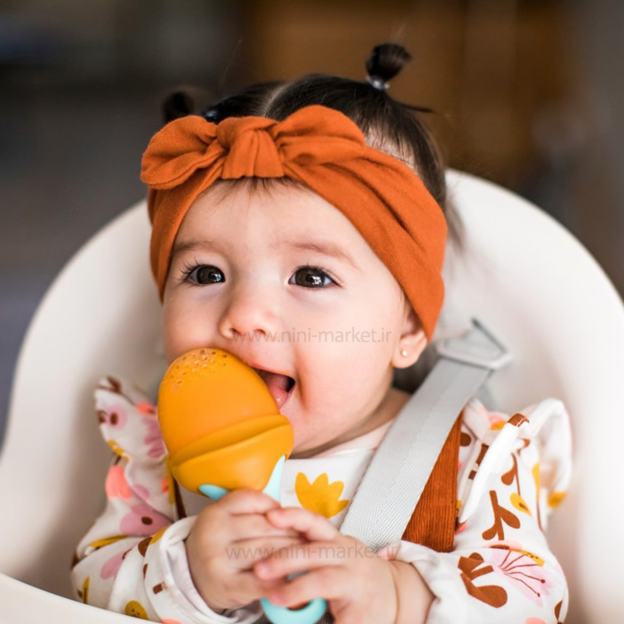 • مزیت : با کیفیت - فاقد مواد مضر شیمیایی BPA / PVC- دارای دسته ی مناسب با دستان کودکان - مانع از پریدن تکه های میوه به گلو – مانع از خفگی – تقویت لثه