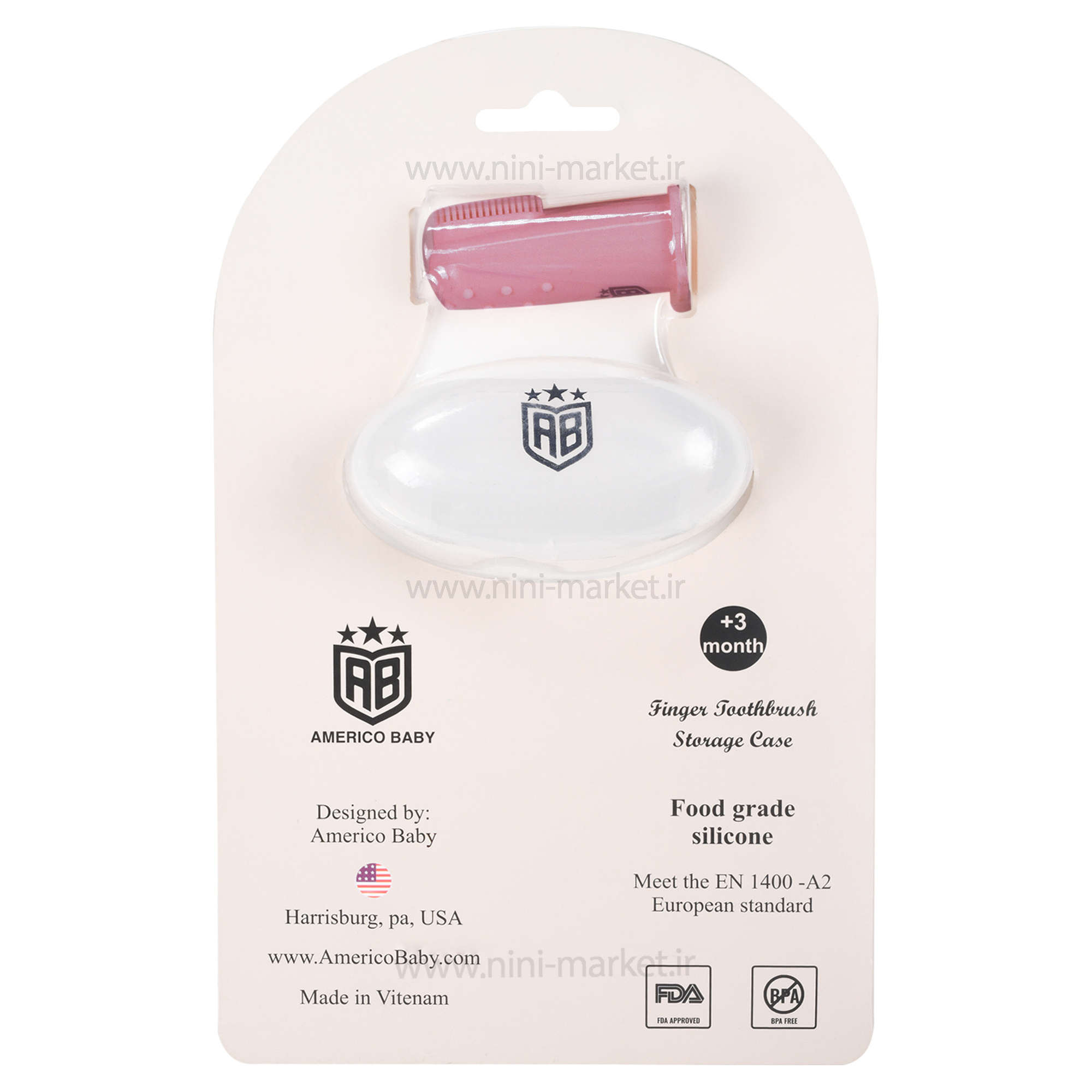 مسواک انگشتی سیلیکونی بنفش امریکو بیبی Americo Baby همراه قاب، در رنگ بندی متنوع که گزینهای مناسب در زمان درآوردن دندان، کلافگی ناشی از خارش بسیار نوزاد میباشد. بهتر است تا با کمک مسواک انگشتی که دارای برس نرم و سیلیکونی می باشد، لثههای ملتهب و دردناک نوزاد را ماساژ داد تا با این روش کمی آرام شود.این مسواک تهیه شده از جنس سیلیکونی درجه یک، ایمن می باشد و فاقد هر گونه مواد مضر مانند فتالات و بیسفنول آ BPA است. مسواک انگشتی برای تمیزکردن دهان نوزاد پس از خوردن قطره آهن و ویتامین و همچنین جهت تمیزکردن دندانهای کوچک نوزاد پس از رویش گزینه مناسبی می باشد. این محصول طراحی و ابعاد مناسبی برای قرارگرفتن در انگشت والد را دارد و بعد از استفاده میتوانید آن را داخل قاب بگذارید تا آلوده نشود.