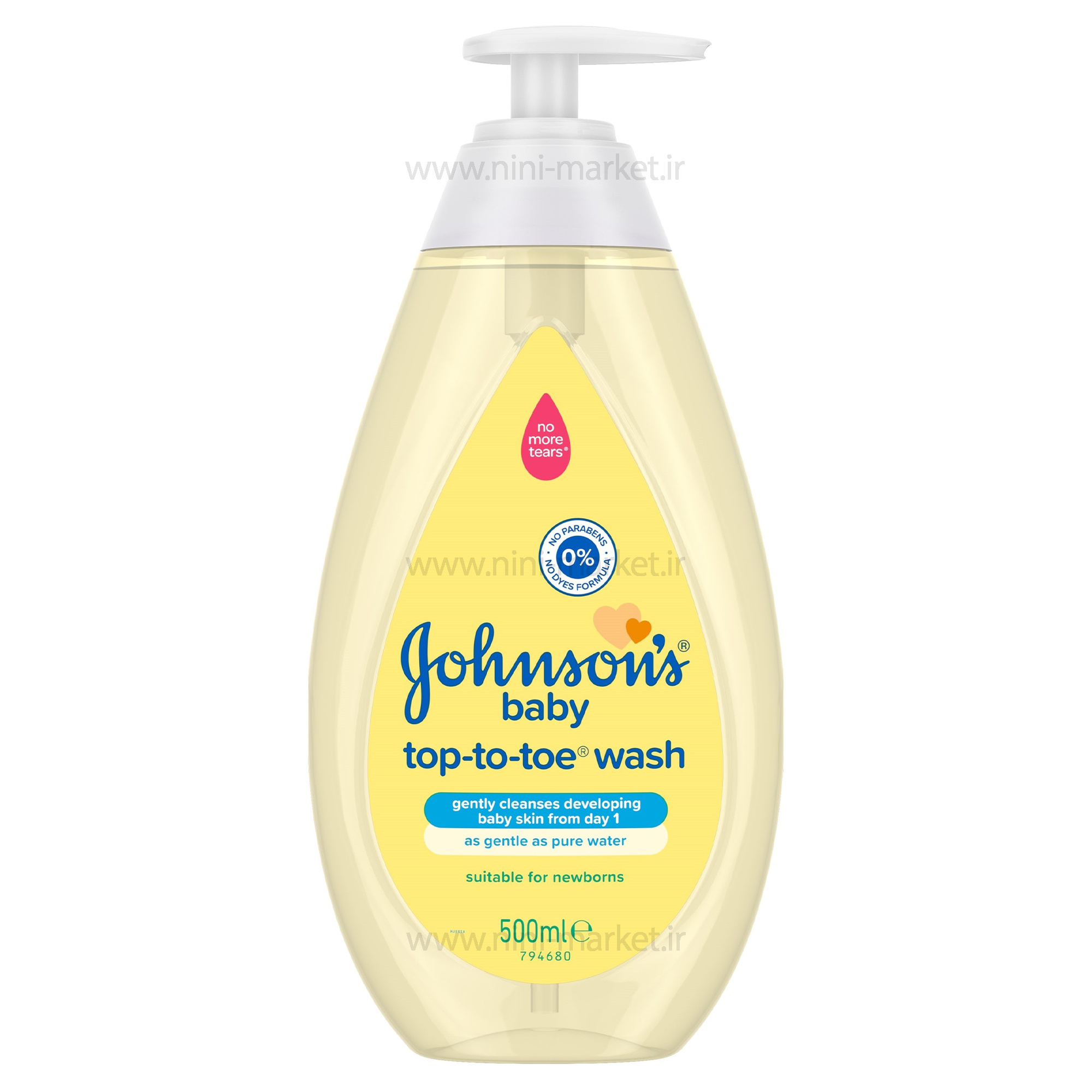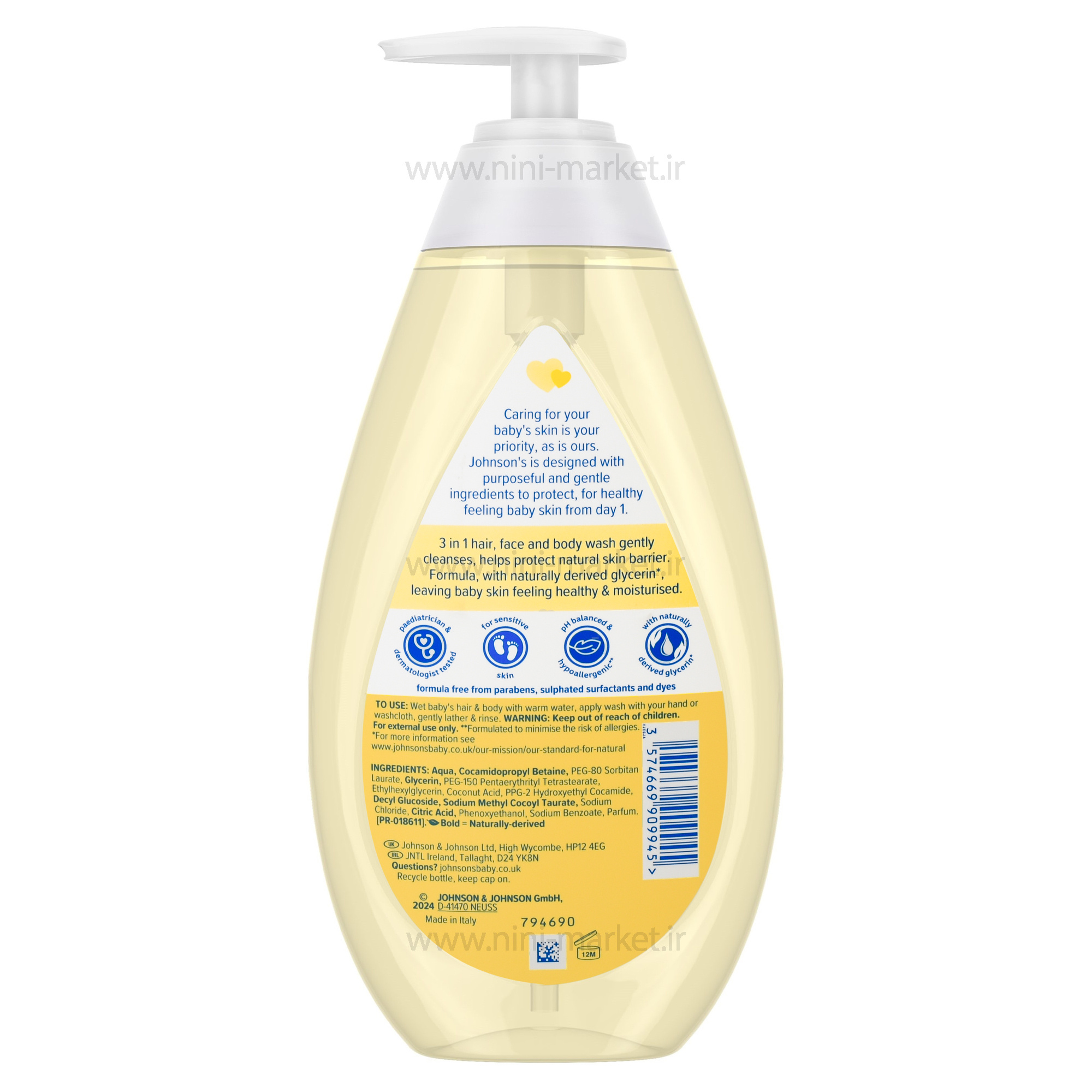شامپو سر و بدن و صورت 500 میل اروپا جانسون، با فرمولاسیونی بسیار ملایم و مناسب استفاده از روز اول تولد طراحی شده است. این شوینده ۳ کاره، پوست، مو و صورت نوزاد را بهآرامی تمیز کرده و در عین حال از سد طبیعی پوست محافظت میکند. ترکیبات آن حاوی گلیسیرین طبیعی است که به حفظ رطوبت و نرمی پوست کمک میکند. فرمول اختصاصی NO MORE TEARS به گونهای طراحی شده که به نرمی آب خالص بوده و باعث سوزش چشم نمیشود. این محصول با تأیید متخصصان کودکان و پوست، هیپوآلرژنیک و با تعادل pH مناسب برای پوست حساس نوزادان است. همچنین فاقد رنگ، پارابن، فتالات، سولفات، الکل و صابون میباشد.