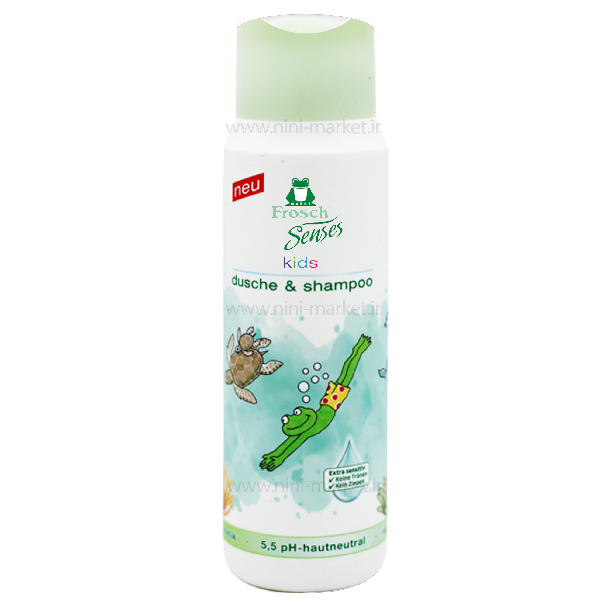 شامپو سر و بدن 300 میل Frosch Senses پوست را تمیز می کند و حس خوشایند و شادابی را از خود به جای می گذارد. یکی از مهم ترین لوازم بهداشتی برای نوزاد و کودک، شامپو است که به طور مستقیم به پوست و مو او در ارتباط است. این محصولات به طور گسترده تولید کارخانه های ایرانی و خارجی در بازار موجود هستند، اما با این وجود انتخاب برای والدین کار سختی است چرا که باید محصولی را برگزینند که از هر جنبه ای ایده آل و مناسب برای فرزندشان باشد. مسائل مهمی از جمله مواد اولیه، سوزاندن یا نسوزاندن چشم ها، عطر و بوی محصول و عدم آلرژن بودن آن باید به دقت مورد توجه قرار گیرد. برند فُرش یک برند آلمانی معتبر در تولید محصولات بهداشتی نوزاد و کودک است و شما می توانید با خیال راحت از محصولات این برند استفاده کنید. فرمول ملایم با پروتئین گندم، شانه آسان مو را تضمین می کند. بنابراین شامپو سرو بدن کودکان Frosch Senses با فرمول مراقبتی حساس و خنثی با pH 5.5 که فاقد رنگ، EDTA، پارابن، مواد حیوانی یا میکروپلاستیک است، مخصوصاً برای جوانهای ما ساخته شده است. سازگاری بسیار خوب پوست از نظر پوست تایید شده است. شامپو ژل دوش Frosch Senses به ملایمت از بدن کودک مراقبت می کند و پوست را به خوبی تسکین می دهد. فرمول خنثی نرم با pH 5.5 و پروتئین گندم، شانه آسان مو را تضمین می کند و چشم را تحریک نمی کند. پانتنول موجود در شامپو سر و بدنFrosch Senses پوست و موی کودک را نرم و تغذیه می کند و رطوبت را در آنها حفظ می کند. فاقد پارابن است. تاریخ انقضا این محصول 12 ماه پس از باز کردن آن می باشد .