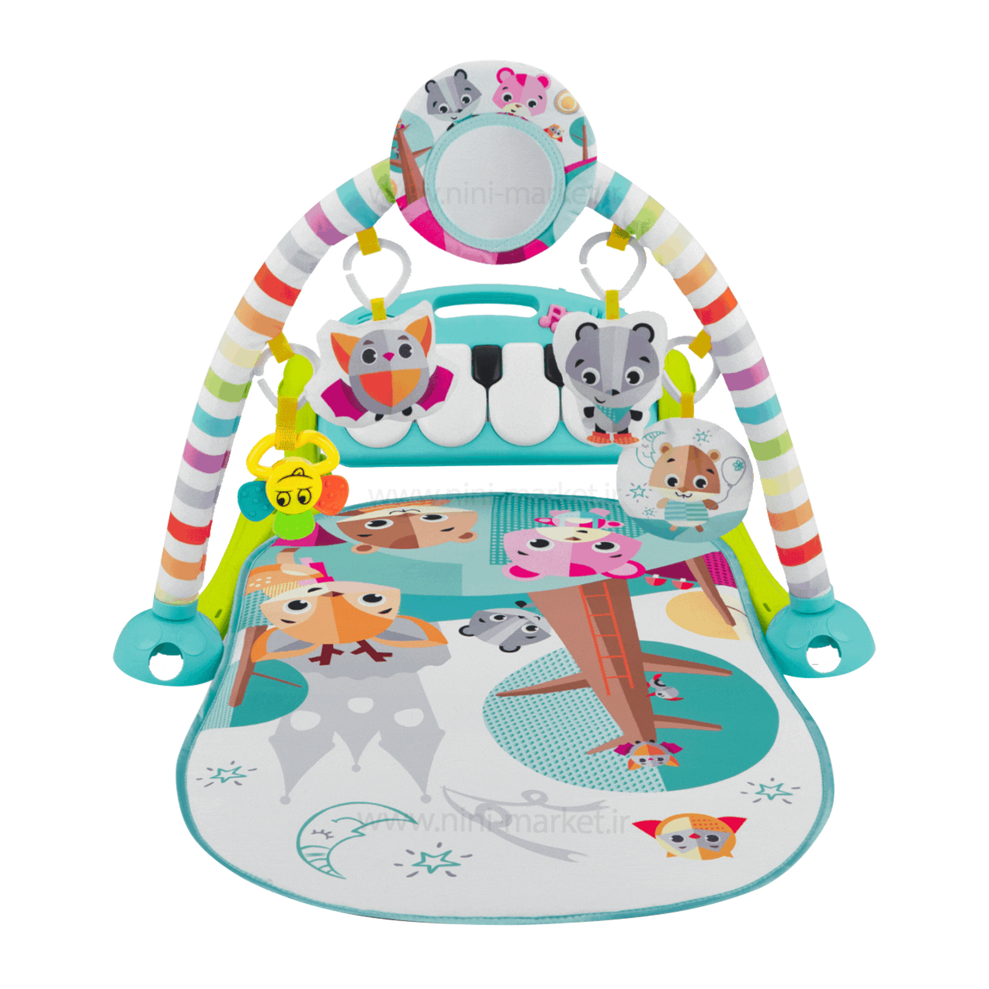 تشک بازی پیانو دار و پلی جیم موزیکال کیکابو kikkaboo یکی از بهترین پلی جیمهای موزیکال میباشد. این سری از محصولات برای سرگرمکردن نوزاد طراحی و تولید شدهاند. شروع استفاده از قسمت تشک بازی این محصول از بدو تولد میباشد. این پلی جیم از یک تشک بازی، بالشتک، آویزهای پولیشی و پلاستیکی (کاربرد دندانگیر و جغجغه را دارند). این محصول به دلیل داشتن تشک با رنگنبدی خاص هر کودکی را به خود جذب خواهد کرد. آینه موجود در کمان قوس این تشک باعث آشنایی کودک با عملکرد انعکاس میشود، و کودک میتواند خود را در آینه ببیند و سرگرم شود. کودک میتواند در ۳ حالت نشسته، خوابیده رو به شکم و خوابیده رو به پشت بر روی این تشک بازی کند و از پیانو هم استفاده کند. بعد از آن که کمی بزرگتر شد، میتواند با استفاده از دستگیره پیانو، آن را در دست بگیرد و از بازی با آن لذت ببرد. بازی و آشنایی کودک با پیانو باعث تقویت مهارت استفاده از وسایل موسیقی در بدن آنها میشود. طراحی زیبا و جذاب تشک مکانی آموزشی و تفریحی را برای کودک فراهم میکند، این تشک با امکاناتی که دارد باعث رشد و تکامل آموزشی کودکتان میشود.