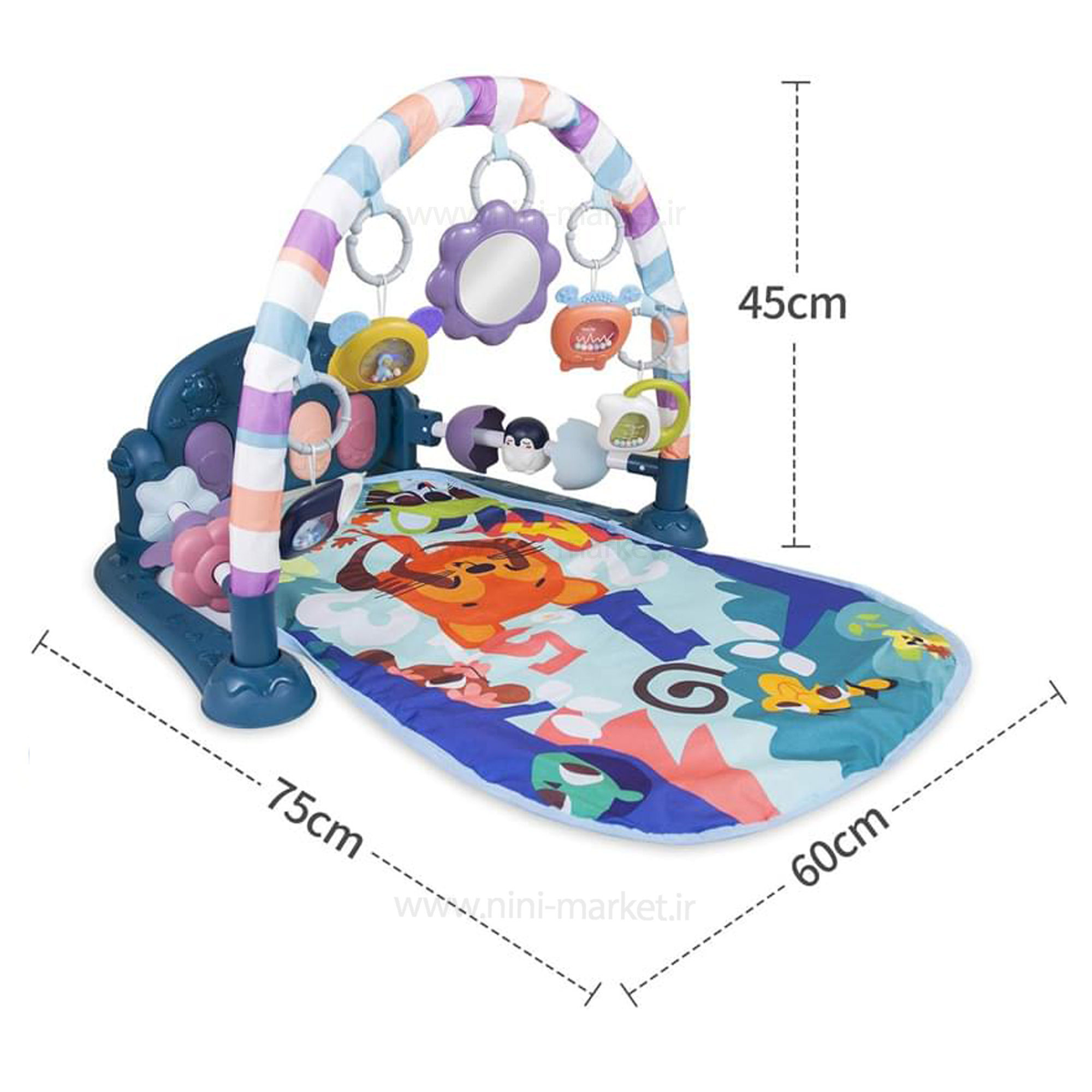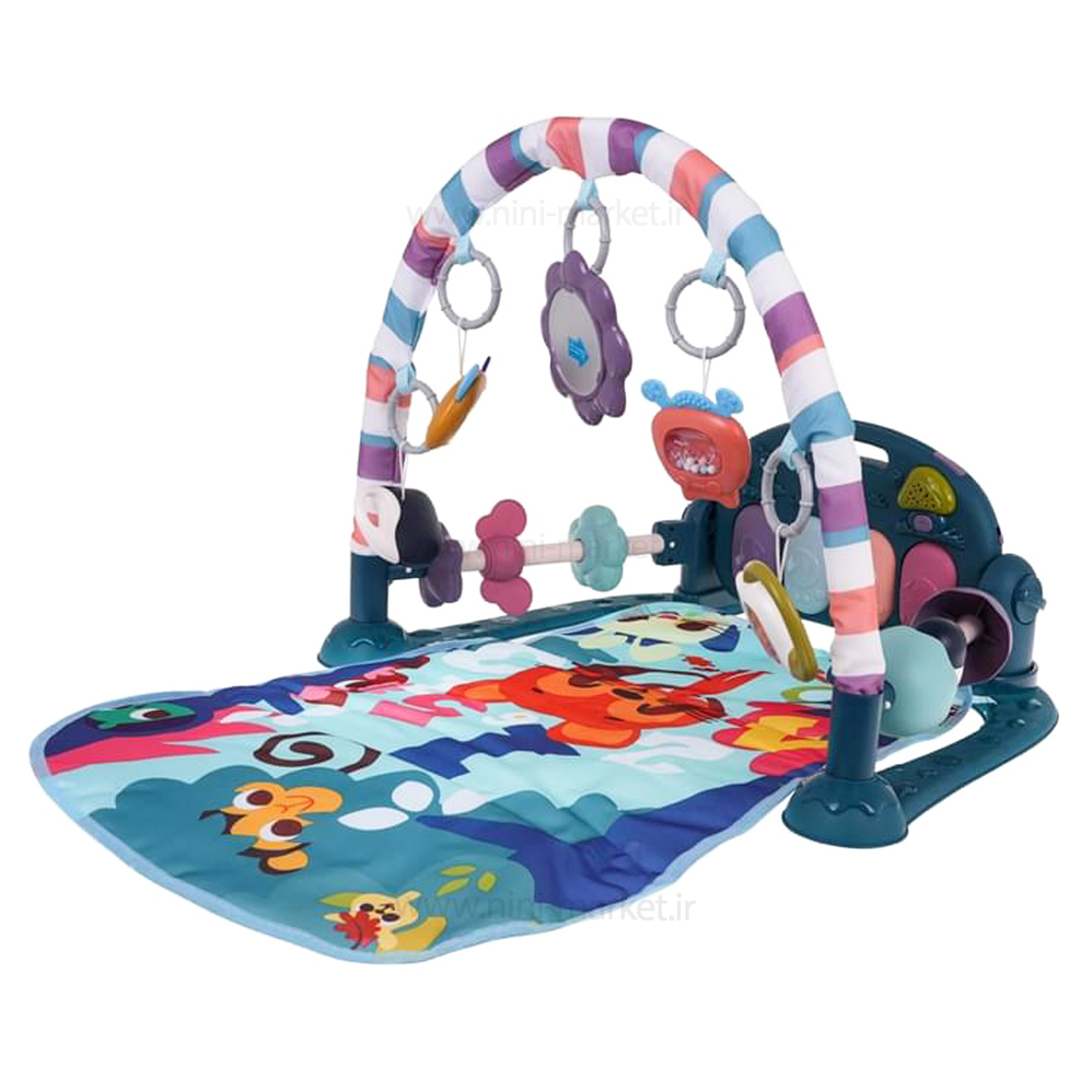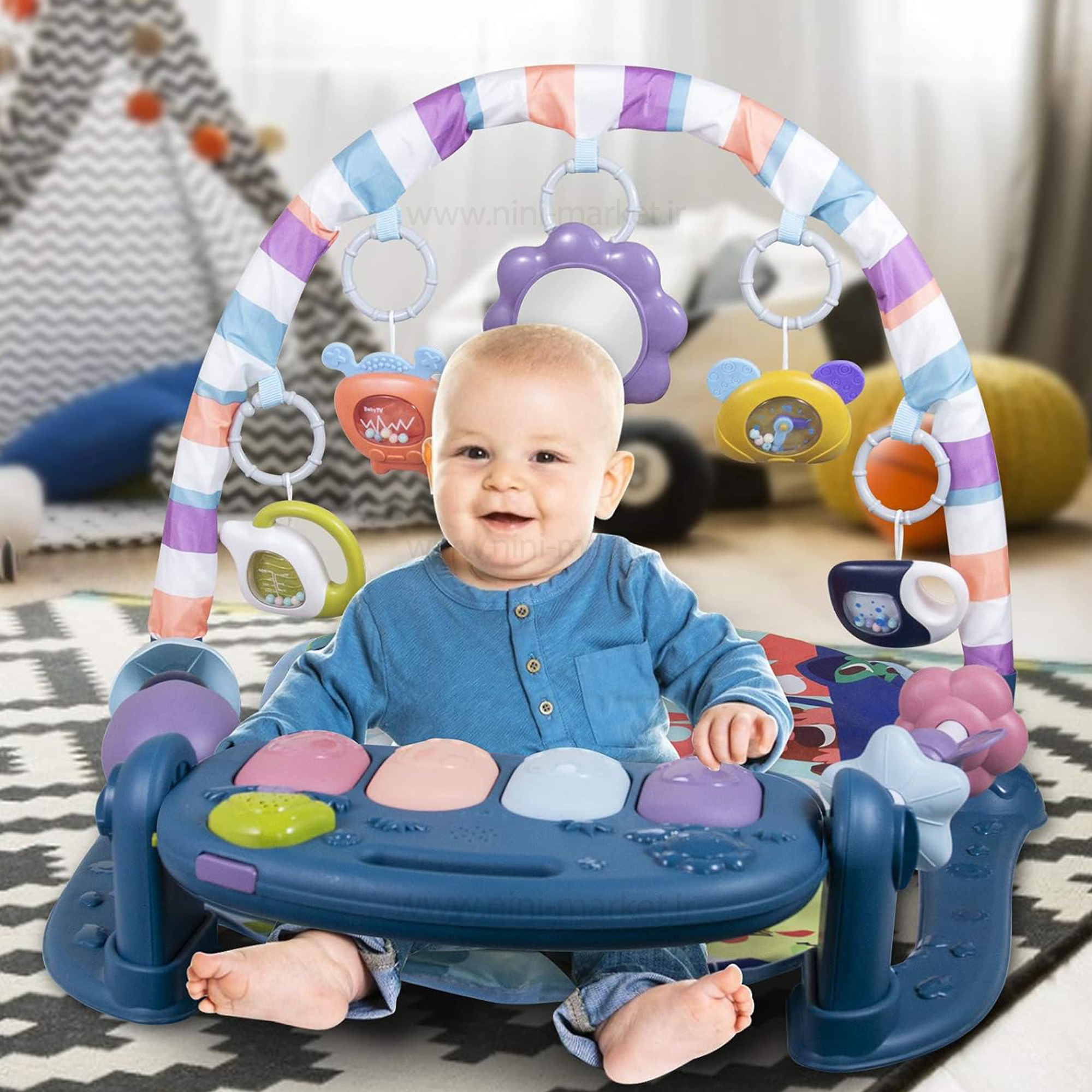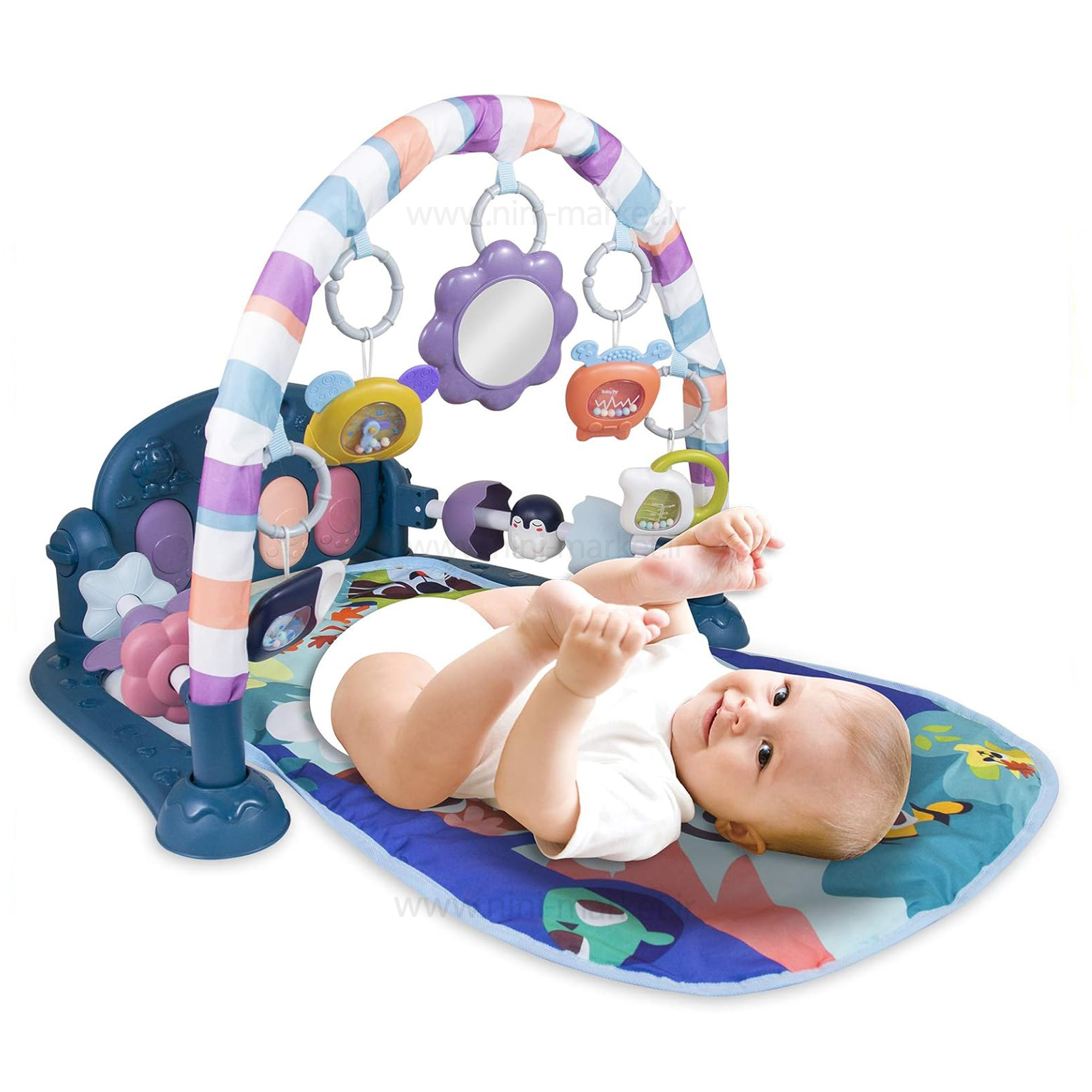 خرید تشک بازی موزیکال برای نوزاد، صرفاً یک تجربه لذتبخش از تهیهٔ یک اسباببازی برای نوزاد نیست.باز کردن دری به دنیای خیالانگیز کودکانه است. جایی که نوزاد شما با صدا، رنگ و حرکت آشنایی پیدا میکند.تهیه تشک بازی؛ یعنی کمک به رشد مهارتهای کودک شما در کنار سرگرمی و لذتی که از هر لحظهٔ آن میچشد.این تشک بازی از نوع پیانویی محسوب میشود. در قسمت پایین پای کودک صفحهکلیدی متشکل از چهار کلید رنگی قرار دارد. با فشار هر کدام از کلیدها صدایی دلنشین از صفحهکلید پخش میشود. منبع تغذیه این پیانوی کوچک، سه عدد باتریقلمی است. بهطورکلی این محصول از دو حالت بازی برخوردار است؛ نوزادی تا شش ماهی و ششماهگی به بعد. در بدو تولد نوزاد خود را روی تشک بازی بخوابانید. در بالای سر او کمان قوسیشکل، همراه با پنج عروسک آویز قرار میگیرد. بزرگترین لذت کودک شما بازی با این آویزها خواهد بود. او بیوقفه تلاش میکند آویزها را به دست بگیرد و مهارتهای حرکتیاش افزایش مییابد. در کنارههای تشک بازی دو میله با دو امکان مختلف بازی قرار گرفتهاند. کودک شما با دست خود آنها را تکان داده و لذت میبرد. در همان حالت درازکش، کودک شما کف پای خود را به کلیدهای پیانو میکوبد. با پخش موزیک او به وجد میآید و مهارتهای ارتباطیاش افزایش مییابد. کلیدهای پیانو همراه با رقص نور و پخش موزیک باعث سرگرمی کودک میشوند. در آستانه ششماهگی، کودک شما دیگر راحت مینشیند. در همان حالت نشسته، با عروسکهای آویز یا صفحهکلید به بازی میپردازد.