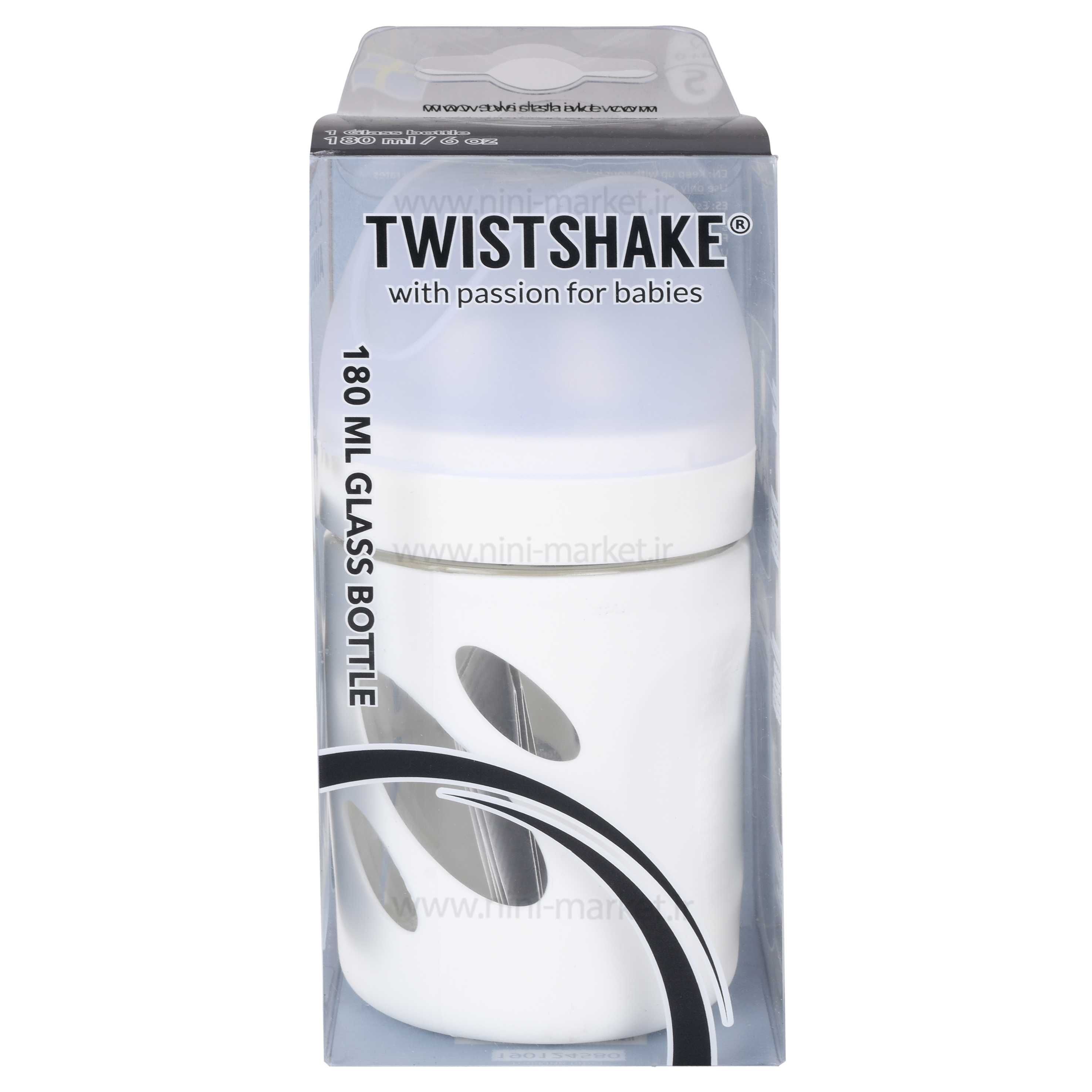 شیشه شیر 180 میل گیرکس کاور دار رنگ سفید Twistshake تهیه شده از جنس پیرکس با کیفیت و اعلاء است.رویه ی سیلیکونی این محصول مراقب انتقال گرمای داخل شیشه به دستان نوزاد است.این شیشه می تواند درجه ی حرارت از یخ زدگی تا آب جوش را تحمل کند.سرشیشه ی این محصول از نوع گرد و تهیه شده از جنس سیلیکونی نرم و منطعف است.تک قطره و مناسب برای نوزادان از بدو تولد است.سر شیشه ضد کولیک و قولنج است و از ورود هوای اضافی به معده ی نوزاد جلوگیری می کند.در ساخت این محصول از هیچ ماده ی مضری مانند فتالات، PVC و بیسفنول آ BPA استفاده نشده است.می توانید آن را داخل مایکروویو نیز بگذارید. بطری شیشه ای در قفسه بالایی ماشین ظرفشویی قابل شستشو است، با این حال توصیه می کنیم بقیه قطعات را با دست بشویید زیرا ممکن است در ماشین ظرفشویی تغییر رنگ دهند.