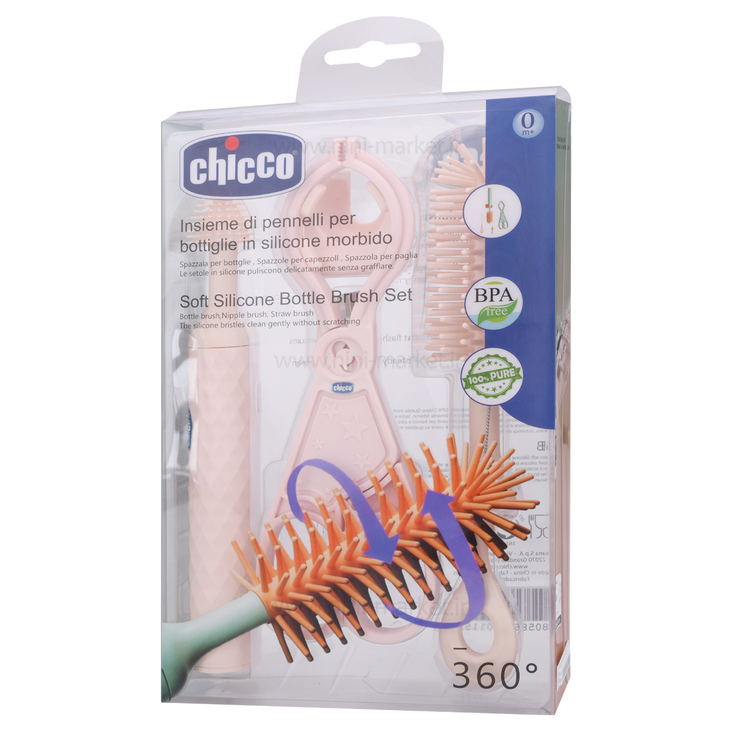 شیشه و سرشیشه شور سیلیکونی برقی چیکو Chicco یک ست کامل برای تمیزکردن لوازم غذاخوری نوزاد. تمیزی شیشه شیر، پستانک و سایر وسایل غذاخوری کودک چون مستقیم با دهان کودک در تماس هستند که مهم‌ترین طریق انتقال آلودگی و بیماری به بدن است.شستن ظروفی مانند شیشه‌شیر که امکان دسترسی به قسمت‌های زیرین آن وجود ندارد، مشکل‌تر است؛ دهانه باریک ظروف این‌چنینی به شما اجازه نمی‌دهد که از دست خود برای شستشوی این قسمت‌ها استفاده کنید.در اینصورت در این شرایط برس شیشه شور وسیله ای سودمند است.