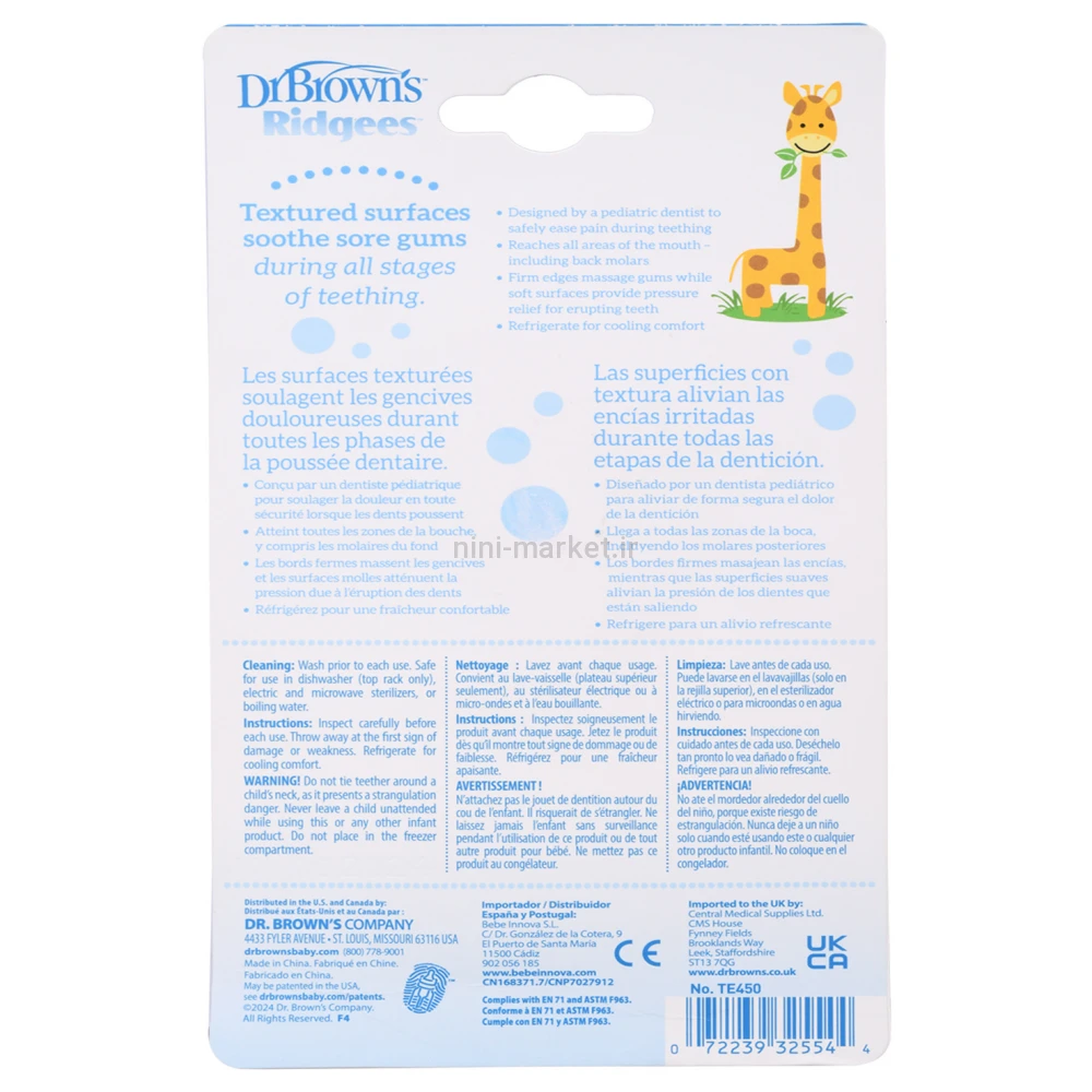 دندانگیر طرح زرافه دکتر براون Dr.brown یک وسیله مناسب برای ازبین‌بردن خارش و تسکین درد لثه نوزاد در زمان رشد دندان‌های نوزاد است. طراحی این دندان‌گیر به‌گونه‌ای است که به‌راحتی قابل‌استفاده برای دندان‌های عقبی نوزاد نیز است. این دندان‌گیر از مواد اولیه بسیار باکیفیت و فاقد ترکیبات شیمیایی مضر تهیه شده است. به‌علاوه، دندان‌گیرهای دکتر براون دارای طرح‌های مختلفی مانند زرافه و فیل و… است که توجه کودک را به خود جلب می‌کند. در ادامه بیشتر با ویژگی‌های این محصول آشنا خواهیم شد.محصول فوق از جنس سیلیکون است و در ساخت این دندان‌گیر از مایع خنک‌کننده لثه استفاده شده است. این مایع خنک‌کننده مانند کمپرس سرد عمل می‌کند و درد لثه‌های کودک را کاهش می‌دهد.