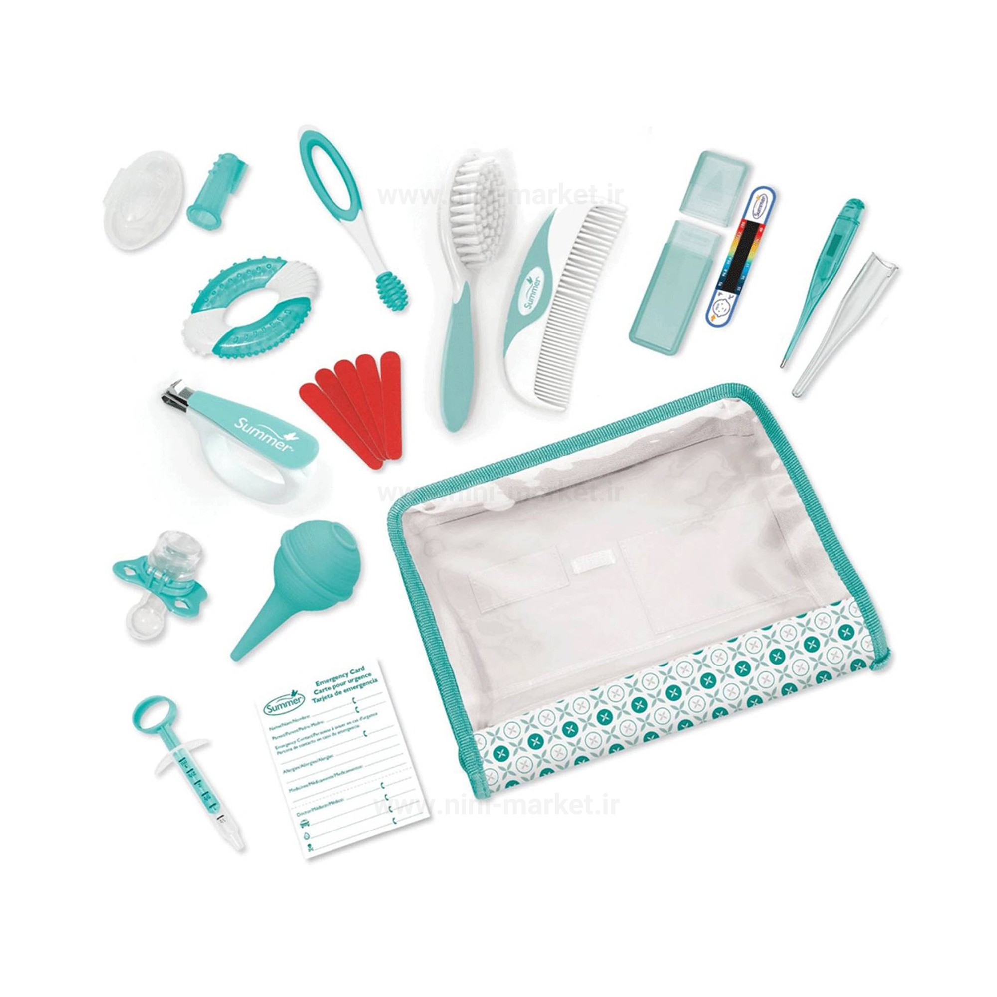 این ست بهداشتی که یک پک کامل به شکل کیف که 21 تکه شامل محصولات ضروری و اولیه کودک را داراست. که این اقلام شامل : شانه و برس - تبسنج- مسواک انگشتی و ماساژور لثه- پوآربینی- ناخنگیر و سوهان ناخن - دارای داروخوری پستانکی برای داروهای غیر تلخ- دارای داروخوری سرنگی برای داروهای تلخ- دارای دندانگیر و ... است. نوزاد تازه متولد شده نیاز به مراقبتهای ویژهای دارد. برای این مراقبتها نیاز به لوازمی است که بایستی از جنس و کیفیت بالایی برخوردار باشد تا به پوست لطیف و حساس کودک آسیبی وارد نکند. معمولا قرار داشتن تمامی لوازم بهداشتی کودک در کنار هم و در یک مجموعه، علاوه بر همرنگ بودن و از یک برند بودن، مقرونبهصرفه خواهد بود. همچنین داشتن یک کیف برای تمامی این وسایل ریز باعث میشود تا از گمشدن آنها جلوگیری شود. ست بهداشتی برند «سامر» یک مجموعه کامل از تمام وسایلی است که از بدو تولد نوزاد مورد نیاز شما میشود. این ست 21 تکه، شامل ضروریترین و پرکاربردترین لوازم اولیه است. این ست شامل شانه و برس بوده که برس آن دارای الیاف نرم است. همچنین شانه آن دارای دندانههای گرد و منظم است. در این مجموعه دو نوع مسواک قرار داده شده است. یک مسواک آموزشی است و کودک قبل از مسواکهای معمولی از آن استفاده میکند، این وسیله طرز دستگرفتن مسواک را به کودک آموزش میدهد. همچنین مسواک انگشتی موجود در این مجموعه، بعد از خوراندن قطره آهن به نوزاد به کار شما میآید، به واسطه این مسواک قطره آهن از روی لثه نوزاد پاک میشود و مانع از سیاه شدن لثه نوزاد میشود. پوآربینی از دیگر لوازمی است که در این کیف قرار دارد. برای پاک کردن بینی نوزاد و جلوگیری از گرفتگی آن، بهتر است روزی یکبار از این وسیله استفاده کنید. پوآربینی این برند، جنس پلاستیکی مرغوبی داشته و کاملا انعطافپذیر است. ناخنگیر با سری فلزی، سوهان ناخن و دندانگیر از دیگر وسایلی هستند که در این مجموعه قرار دارند. همچنین برای خوراندن داروهای تلخ مانند قطره آهن و غیرتلخ، دو نوع داروخوری متفاوت در این کیف قرار داده شده است. برای داروهای تلخ از داروخوری سرنگی و برای داروهای غیرتلخ از داروخوری پستانکی میتوانید استفاده کنید. دو نوع تبسنج با کارایی متفاوت، از دیگر لوازمی هستند که در این مجموعه برای راحتی کار شما قرار داده شدهاند.