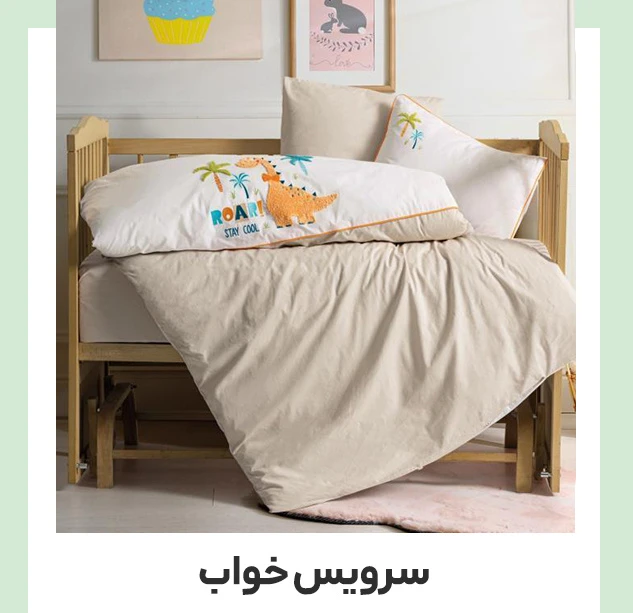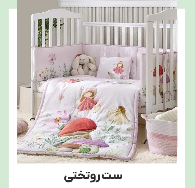 سرویس خواب و ست روتختی: شامل ملحفه، کاور و روتختی مناسب است و محیط خواب نوزاد را تمیز و ایمن میکند. رنگها و جنس مناسب سرویس خواب، حس آرامش و راحتی برای کودک ایجاد میکند.